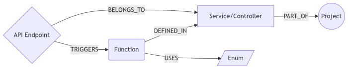 - Nodes: Represents Projects, Services, Functions, and API Endpoints. I even added Domain Entities to bridge the gap between "Business Talk" (e.g., Payouts) and "Code Reality" (