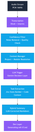 I wanted an intelligence system that could listen to office meetings and transcribe them. But I didn't just want a summary. I wanted something that suggests Jira tickets and creates complete, task-specific prompts that a developer can hand over to an AI agent to execute.