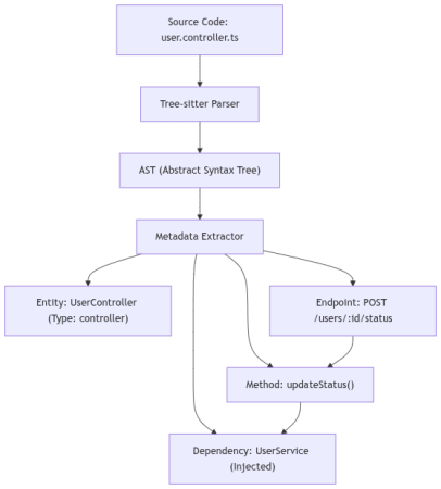 I used Tree-sitter to walk through the codebase because regex just doesn't cut it. Unlike simple pattern matching, Tree-sitter builds a full Abstract Syntax Tree (AST). This allows Srot to identify exactly what a class is by its decorators, knowing the difference between a generic class and a NestJS @Controller or @Injectable service. It crawls the .ts files, peeks into constructors for Dependency Injection, and maps out TypeORM entities to understand your data schema.